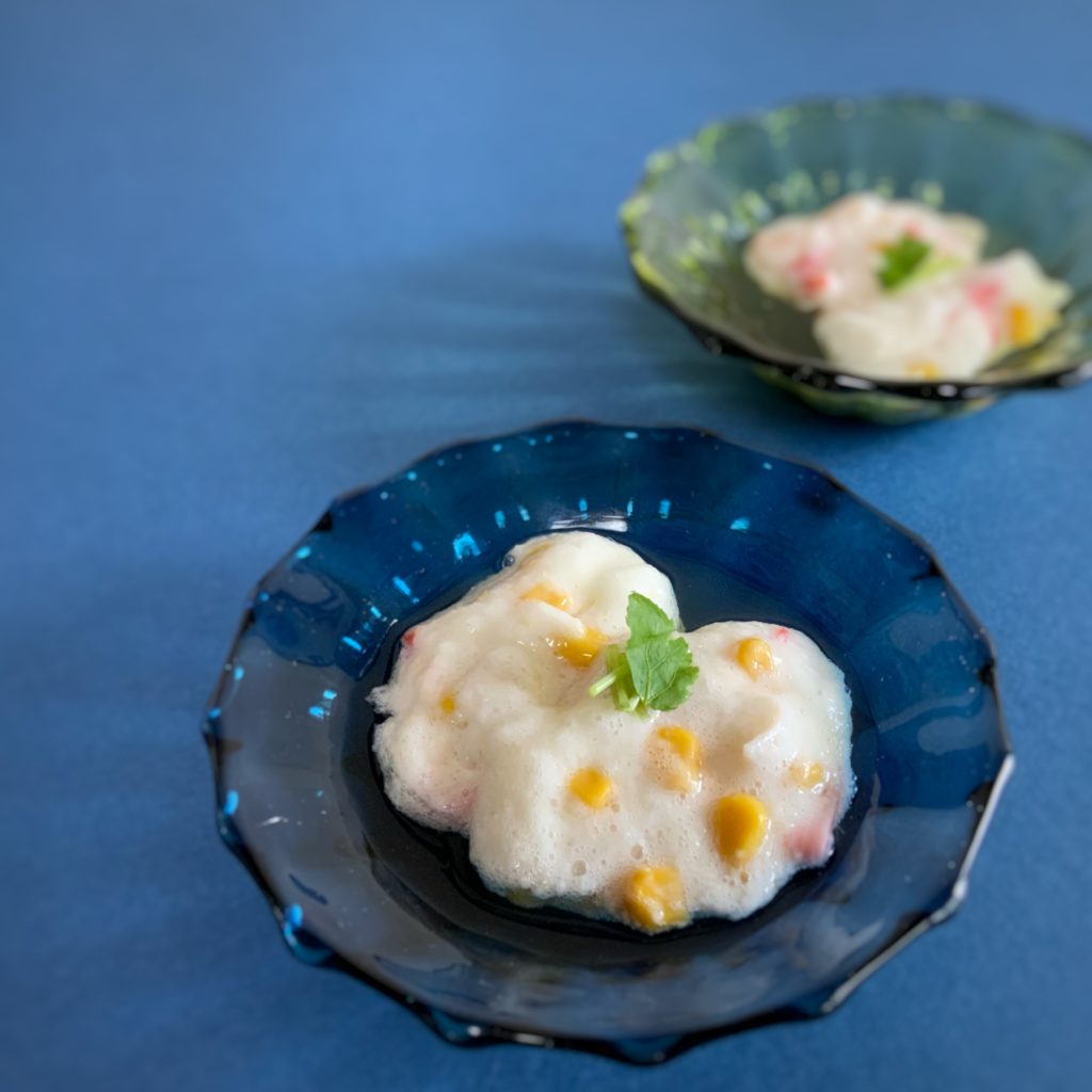 - 深めの器に 1.の合わせ酢を入れ、3.をスプーンですくって落とす。